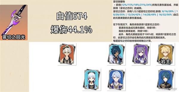 评价:神里绫华专武,其次大部分元素C都适用。对于大部分能够附魔普攻的角色来说,想要吃满雾切的被动,可以说更加的简单了。毕竟普攻只要造成伤害,就能够触发被动印记。所以,高基础攻击,高爆伤加成、元素伤害加成的雾切,就成为了大部分角色的标配。适用范围非常的广泛,几乎可以说,是个单手剑角色,都能用。