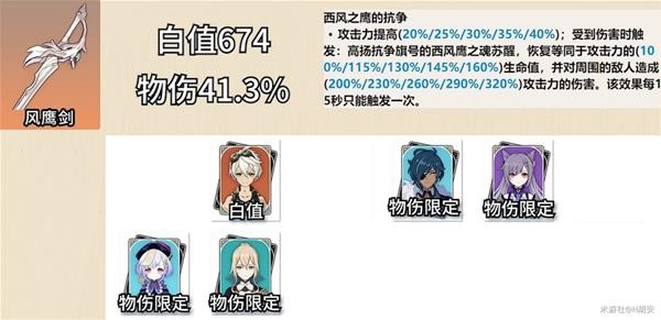 评价:风鹰剑作为开服元老,面板数值不错,技能也还算稍有用处,但也就是锦上添花。可副属性增加物理伤害,直接就锁死了风鹰剑的定位,副词条的物理伤害加成使其泛用性较低,而且副词条不加双爆,所以面板难叠,只能用于平a或重击输出的角色,点赞哥、主c琴或者玩物理刻师傅、凯亚、七七可考虑一用。而继雾切出现之后,终结了其对班尼特白值和刻师傅拯救计划的独占。