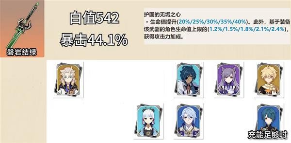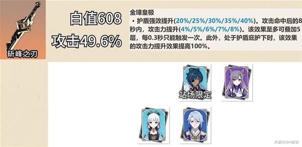 特效:造成的伤害提升10%,触发元素反应之后会产生一个印记,印记叠加到两层之后会触发提升全队普攻、重击以及下落攻击16%的伤害,并且攻击提升20%,效果触发之后的20秒内无法再次获得印记。首先满级的攻击面板608的话是属于比较低的,而属性的攻击面板加到了副属性的元素精通上,副属性合计有将近200的元素精通,也就是说打元素反应的话伤害就会有比较明显的提升。