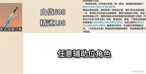 评价:苍古自由之誓作为一把精通副属性武器,泛用性较差,现版本只有万叶和久岐忍比较适合。触发武器特效后,效果非常强力,在高精条件下的特效数值也很惊人。但是低精表现只能说尚可,推荐练万叶而且有余力的人可以抽一把玩玩。