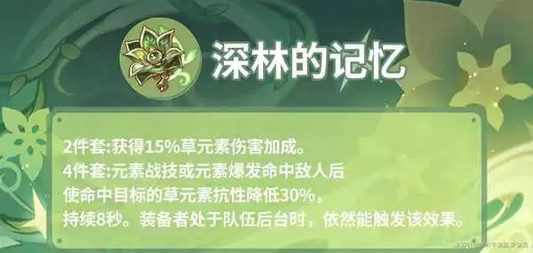 全新圣遗物,2件套提升草伤15%,4件套施放元素战技或者元素爆发后,对命中目标降低30%的草元素抗性,处于后台也可触发。