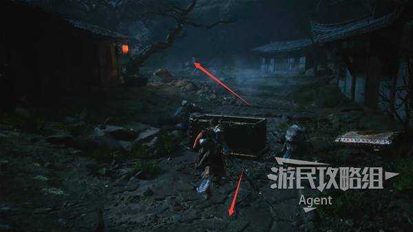 村子正门左边还有条路,先下去搜刮下有个宝箱,然后回来从正门进入村子。