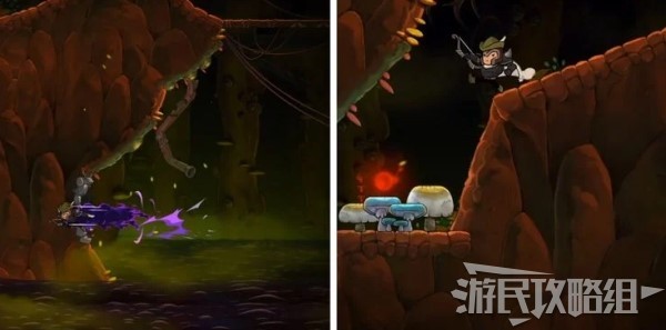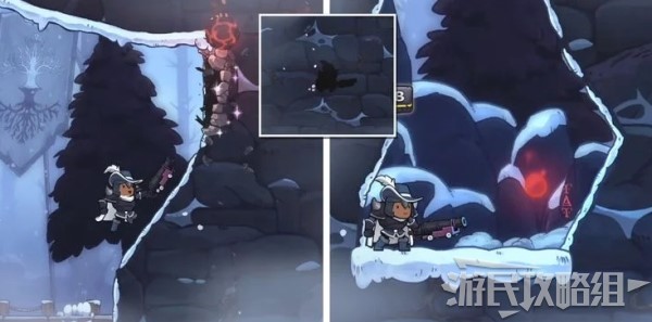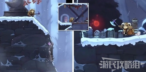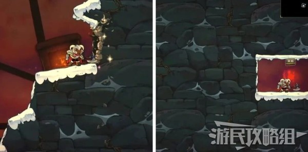 拿到第二个伤疤“简单的开始”之后,往右边走,然后往上跳,来到山崖上的火炉旁,对着右侧墙壁使用攻击性魔法,轰开墙壁后往里走即可找到伤疤“重型武器”。
