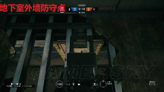 如果点位在地下室,我们的打野可以先破开位置在基地正面左边1L的这面窗户,然后用摔炮或喷子打开2L对着这面1L窗口的地板,就能偷到在正在地下室侧墙贴热炸药的铝热以及其他进攻方队员。这个位置并不是很完美,因为铝热如果贴了炸药后贴墙跑开,我们是打不到的,但是如果进攻方开了墙以后选择在这个位置往里探头,就可以趁其不备将其击杀。