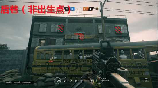 在这里要注意的是,当出生点位于靶场和停车场时,进攻方在进攻之前一定要看清楚黄色阴影线标识的窗户和门有没有被开板,因为树叶遮挡视野的原因,进攻方出靶场的时候是看不到基地正面最右侧窗户的情况的,但是防守方却能很清楚的观察到进攻方的一举一动。同样的道理也用在基地二楼的楼梯位置,因此在进攻之前一定要做好预瞄点,如果有人则可以利用2.5倍镜步枪的优势对敌人进行击杀。