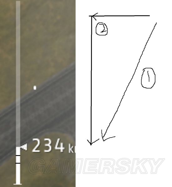 以如图一的航线和目标地为例,在目标地前一点的位置标点,在跳伞点跳伞后,面朝标记点位置视角抬高按住W平着飞,在到达图二(右下角小地图)刚好能看见标记点的位置,立马把鼠标压到最低(视角压低面向地面,途中可以按左Alt观察周围),到达开伞点后鼠标继续压到最低按住W,加上落地前的微调,就能正好落在目标上,此时选择路线①的敌人还在你的头上飞。