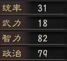 统帅31、武力18、智力82、政治79、兵种弓、战法、智力上升