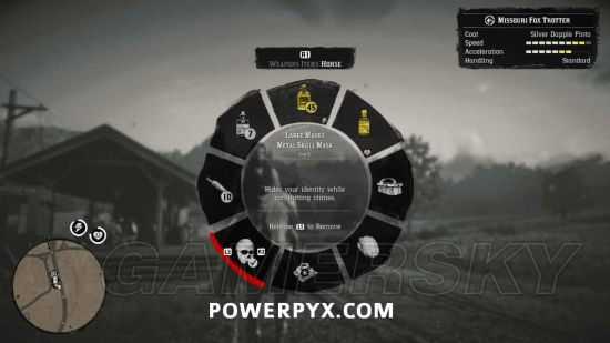 首先需要坐在马背上或站在它旁边,然后打开武器轮,按R1 / RB切换到“马道具轮”,然后选择左下角的面具。