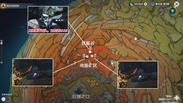 5号:从4号位置飞过来,用元素视野可以看到可打破的石头,在前上方有个炮,用炮轰开就行。炮的调整方向(3左1下)。这里还有个宝箱,视线暗,记得捡。