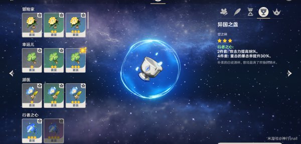 前期三系圣遗物主要以防御和治疗为主,大多数人能够遇到的第一款进攻型圣遗物是17级送的异国之盏。这就是第二阶段最值得拉满的圣遗物:行者套装。