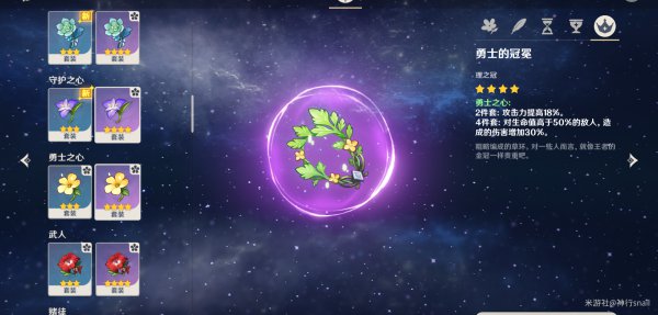 来自璃月各剧情副本。这是玩家第一款能确定入手的紫色品质圣遗物,25级进入世界2后,就应该着手准备打璃月几个提供勇士套装的迷宫副本了。勇士系同样具有攻击力+18%的优秀套装属性,同样在未来相当长一段时间内会作为玩家的主力圣遗物。