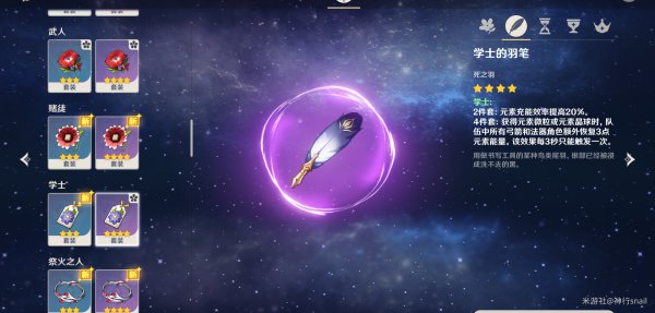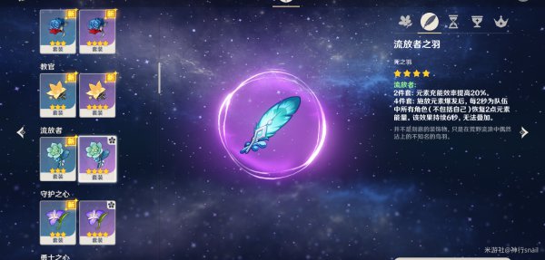 毕竟到了最后辅助也是需要强度的,辅助在获得自己的终极装备之前,元素充能效率是最好的过渡套装,而且特别是元素杯子和时计位置是最好的替代品,例如砂糖、行秋、香菱、迪奥娜、班尼特、芭芭拉这几个非常好用的通用型辅助都可以使用流放者两件套或者流放者学士2+2,连续提供大招。