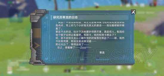 传送完毕我们可以在脚下发现研究院蒂龙的日志,从日志上可以知道权限卡在双子岛南的山上