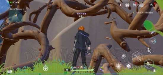 山腰处布满了荆棘,我们不能直接爬上去,可以使用原能手炮,站在原能手炮上使用喷气背包+飞爪上山,也可以找到山腰处的两棵树,爬上树使用喷气背包飞上去。