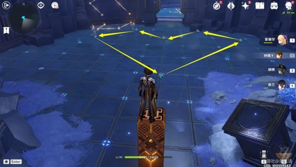 4.根据星图,按照下图操作,把机关转到箭头方向,然后攻击机关发射光线,解谜完成后获得一个精致的宝箱。