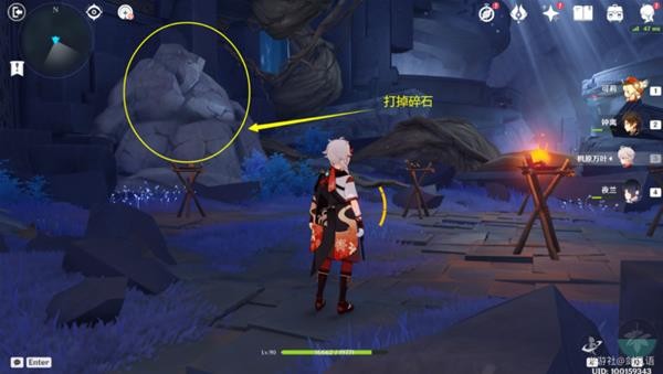 10.来到这里,看到几个火把和大型碎石,先击碎旁边的大型碎石,水流下来,走近火把,看到水的倒影有火焰,即是真的火把,没有火焰是假的。