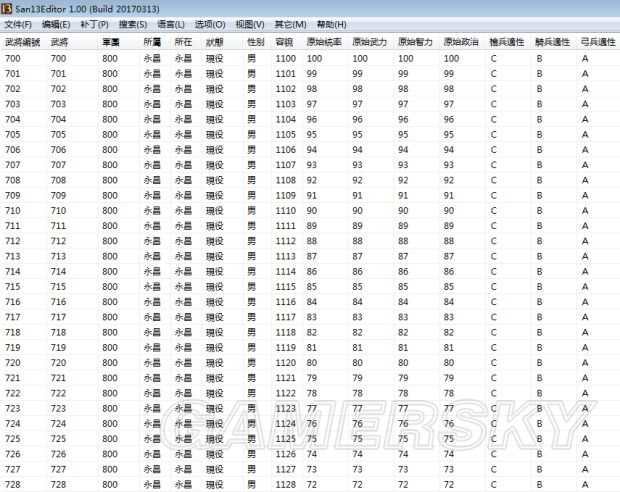 使用Van修改器进行的研究,创作四维1~100适性CBA的武将,这样能地毯式数据研究。研究内容包括都市技术,内政训练巡察等全方位详细数据研究,并用Excel表格记录。
