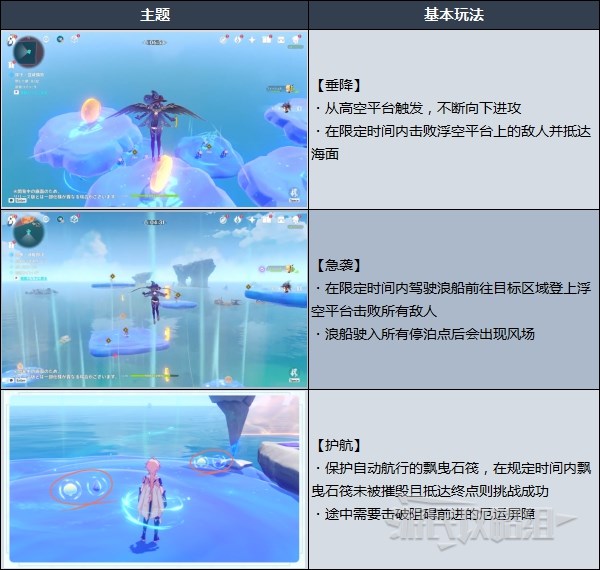 本次活动共有三种小游戏:垂降、急袭、护航。通关条件各不相同,但基本上都是上下跳台、收集货币或道具、讨伐敌人等。