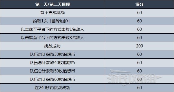 记得沿途收集追想币,第一天挑战奖励的最高评分为500分,需要通过得分目标中列出的获取追想币来尽可能多地获取评分,一边尽可能收集追想币一边击败敌人。挑战过程中会不断出现提示,当出现「垂降加护」的提示时尽量拾取到,通过灵活运用「垂降加护」能够快速将敌人击落平台,更为节省时间,如果看到的话就尽量拾取吧。