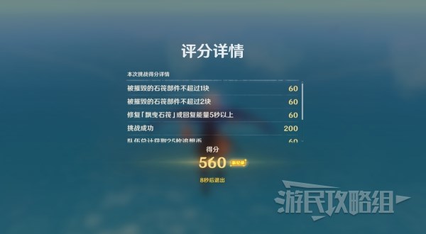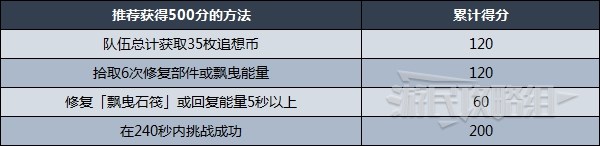 击败敌人后注意拾取蓝色和绿色的掉落能量,累计3次可获得60分、6次可获得120分。但只拾取不返回石筏的话这些能量就无法生效,石筏原本的能量用完之后是无法继续移动的,所以拾取之后要记得返回石筏上充能(修复或充能5秒以上可以获得60分)。