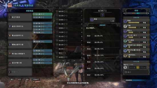 满看破,直接填平角龙弓原本的负会心,保证能打出满拔刀的100%会心,配合超会心的数值修正能打出可观的伤害;耳塞堆满保证龙矢过程流畅不会被吼断,安逸输出。