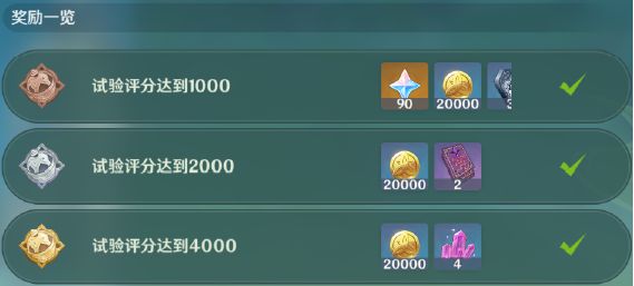 试验评分达到1000即可获得原石奖励,达到4000即可拿满奖励。