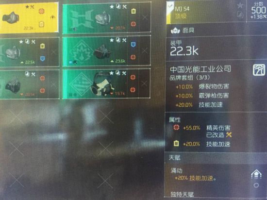阿尔卑斯装甲(电力+任意2属性,建议武器伤+装甲)当然如果你还有tu5遗留下来的政令甲和一件tu5的底子装甲,可以跟我一样洗个爆炸伤,天赋破坏之王or精伤(和背包一样一个)阿尔卑斯甲建议选择红黄蓝插槽的那个(还有一件是黄蓝蓝插槽的)