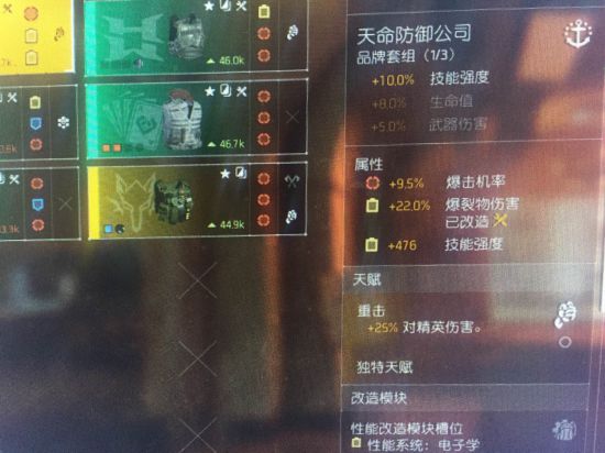 固线装甲(电力+装甲+百分比装甲)天赋电容or装甲,和背包一样一个。