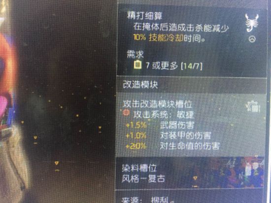 所有红插一律插装甲伤生命伤插件(好像就一个红插槽,插件如图所示,单个武器伤的插件其实不如总体增伤的)。