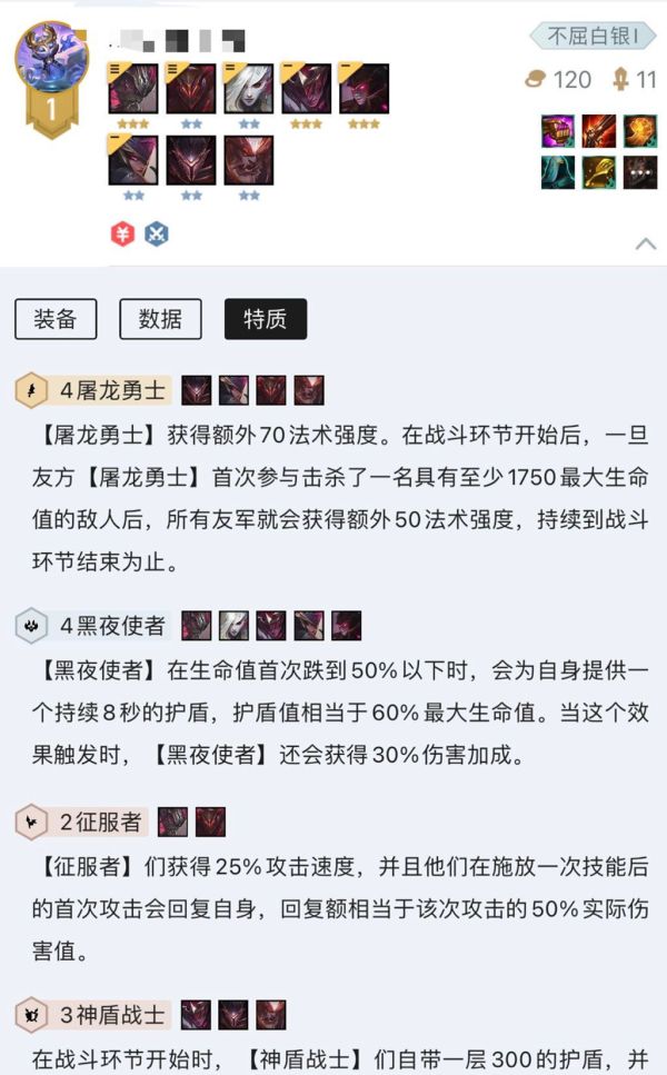 阵容方面选择4黑夜4屠龙3神盾2征服者。
