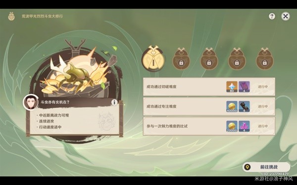 《原神》4.3新活动荒泷甲光烈烈斗虫大修已经上线,一共5个关卡,第一天的关卡已经解锁。下面请看由“浪子神风”带来的《原神》荒泷甲光烈烈斗虫大修行第一天关卡攻略,希望对大家有用。