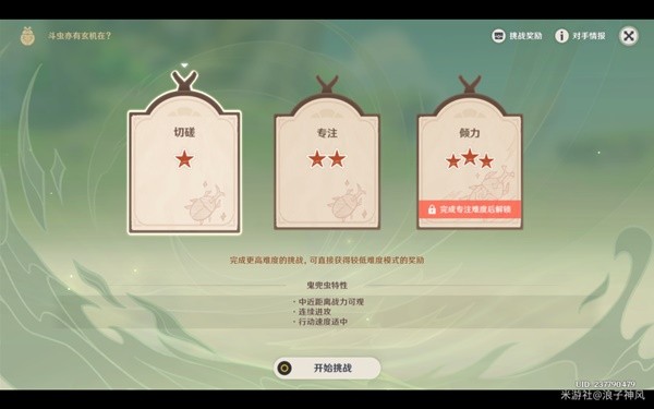 ·每关斗虫挑战均有「切磋」、「专注」、「倾力」3个难度。挑战开启后,「切磋」和「专注」难度会解锁。成功挑战「专注」难度后才可解锁「倾力」难度。