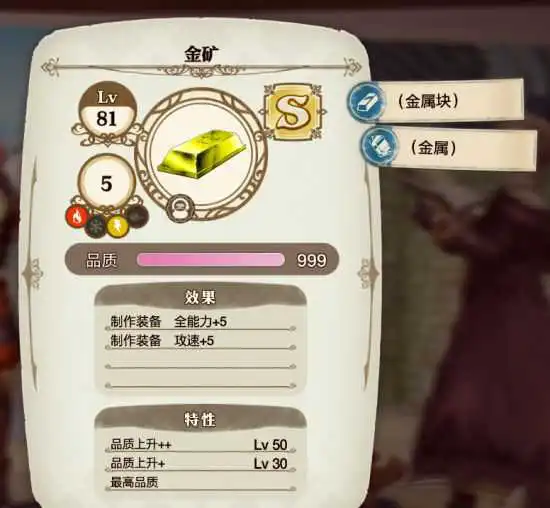 例如一个金块,品质是999,成分是5火5雷,物品类型是金属块/金属,物品效果是制造装备+5全属性/制作装备+5攻速,特性是50级的品质上升++等,炼金等级是81级。