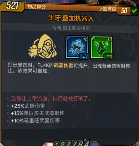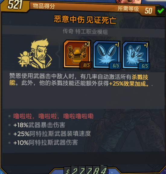 具体效果与死神将至一样。触发几率经过测试约5%-8%左右,非常低的几率。但突突战斗中可通过刷新时间来维持全程2层杀戮buff。所以突突首选,单发武器均不推荐使用除bug或节操外。