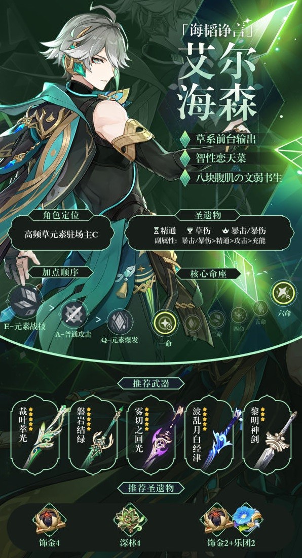 《原神》艾尔海森已经正式加入卡池,很多抽到的玩家想要知道他该如何培养,下面请看“鬼火零喵”带来的《原神》艾尔海森装备及队伍搭配指南,希望能够帮助大家。