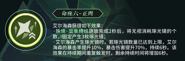 1命的作用主要体现在灵活应变的体验提升和改轴带来的大招伤害提升。E技能CD短可以想放就放,输出轴可控性更强;可以将Q后置从而吃到更高的「琢光镜」层数。但1命算不上刚需,只要沿用我上文讲述的手法,0命是不会卡CD的,体验差距远没有「胡桃」「夜兰」的1命那么大。