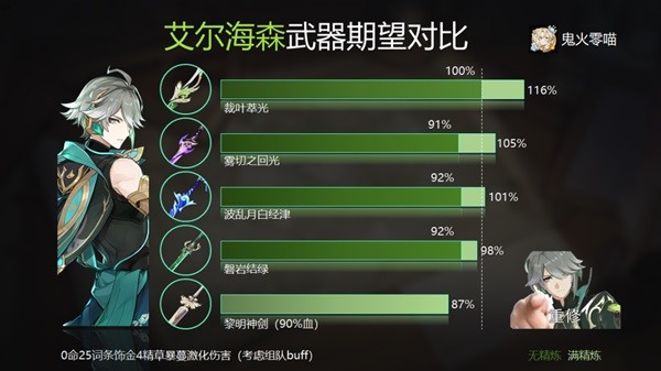 【裁叶萃光】完美契合「艾尔海森」的输出模式,但缺点是非常专,想收益最大化就必须要站场。目前使用的循环轴很难打满次数,与其他下位五星的差距是经典10%。在蔓激化队中「艾尔海森」是毫无疑问的输出核心,最好还是给他一把五星剑用。