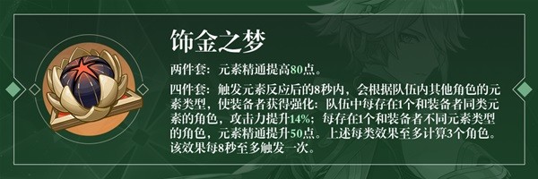 「艾尔海森」作为蔓激化输出核心时,提供精通和攻击词条的【饰金】4是伤害最高的选择,和「纳西妲」毕业套装【深林】4是同一个副本产出,刷取的性价比较高。【饰金】4也是大部分草体系C使用的最优套装,有较高的通用性。四件套属性较差的情况下可以选择2+2【乐团】的散搭。套装效果只是亏了3个词条而已,可以靠副属性弥补。