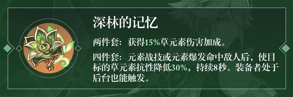「艾尔海森」作为超绽放前台输出时的直伤占比较低,因此选择由自己携带【深林】4,绽放打火机携带【乐园】4或【饰金】4,全力提高超绽放伤害是更优的选择。两件套的草伤加成也不会浪费。