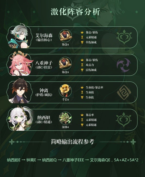 激化队是「艾尔海森」伤害上限最高的阵容,起步成本就要4个金。激化反应多向增益的特性对于「八重神子」和「纳西妲」也有较高的练度要求,一般推荐拥有高词条圣遗物/高命「艾尔海森」/2命以上「纳西妲」的玩家使用。