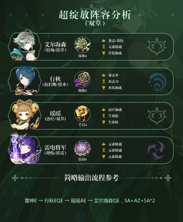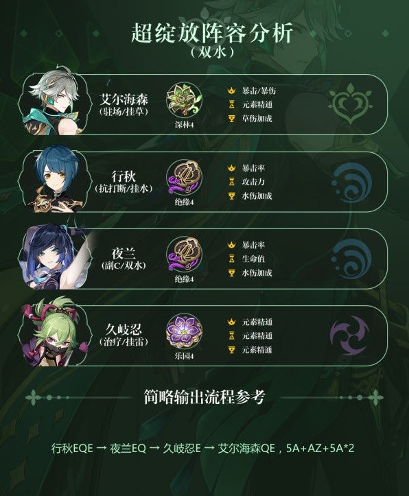超绽放阵容有两类变种,其中「行秋」提供最关键的抗打断不可替换。双水阵容的产种数量更多,但激化基本可以说是没有,伤害构成更偏向「行秋」「夜兰」的后台输出和超绽放伤害,适合练度较低的「艾尔海森」选择。双草阵容提升了激化率和精通,「艾尔海森」自己的直伤更高,但产种数量就变少了。
