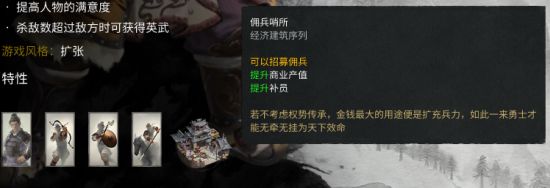 雇佣兵系列有几个特色,首先是招出来就满员,换句话说就是有钱一切皆有可能。其次从战斗力来说,雇佣兵同比类似单位战斗力并不弱(抗性差一些,更容易战损)。然后就是雇佣兵不受五行搭配的限制,对于统兵将领的五行属性没有要求,最后就是雇佣伯长可以替代将领带兵(需要佣兵哨所)!当然这个特性一般用处不大,相信各位玩家也比较少遇到有兵无将的情况。