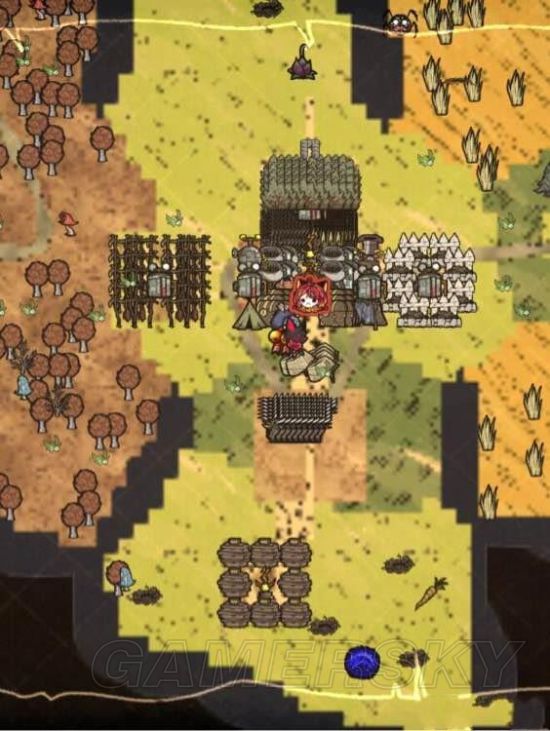 2.第二好的人物,如果解锁了的话,就是维京女了。自带25%防御,125%攻击,有优良的头盔和矛,打怪回复san和血能单靠蜘蛛巢永动,打架身手一流。唯一的问题---前期只吃肉---可以靠建家选址在猪村(后面再解释)杀狸猫做肉丸解决。但,种子在地上烦得不行不行的。