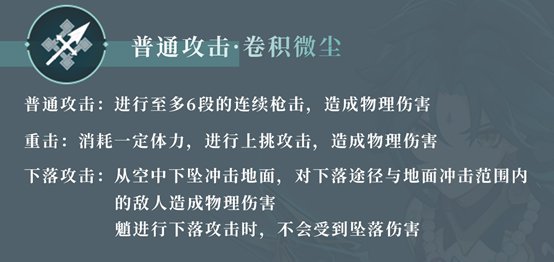 重击不同于其他长枪角色,不会向前突进,且能够挑飞敌人,倍率处于中流地位。