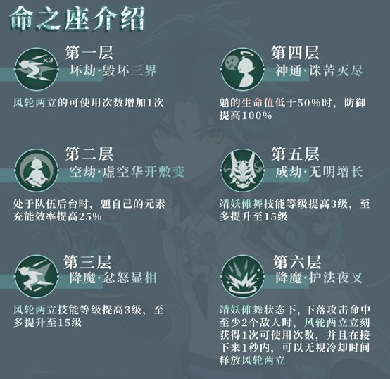 解锁此命座后,「风轮两立」升级优先度将高于「靖妖傩舞」,同时魈的输出方式得到大幅度的改变,但此命座对单体精英怪时相当于报废。(除去一些可以召唤怪物的敌人比如冰萤/雷萤术士)