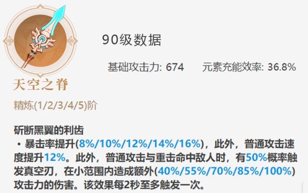 天空之脊:在提供高白攻的同时减少了魈的充能需求,让魈可以加入到无双风的队伍中,为队伍搭配提供了更多的选择。