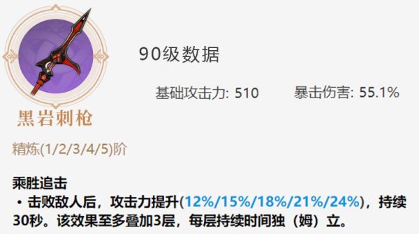黑岩刺枪:十分暴力的提供了几乎堪比五星暴伤头的暴击伤害,虽然武器技能触发条件较为苛刻,但面对群怪时能让魈的输出能力更上一筹。