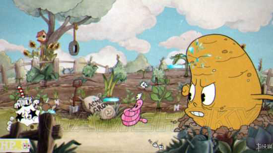 土豆会从身体下方吐出泥土和粉红色的蚯蚓,一边射击一边有节奏跳跃即可打过。土豆快死亡的时候会加快喷吐速度,在间歇较小时可以借助空中闪避(Y)一次性飞跃两个土豆的泥块子弹从而避开攻击。