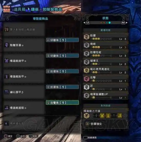 而防御性能方面,当前版本下铳枪如果想要防御所有攻击则至少需要防御性能4点,但由于爆锤龙的3件套效果,防御性能3点即可在不过分消耗耐力和体力的情况下防御如灭尽龙的如来神掌的3段打击,炎王龙和冥灯龙的核爆,不需要躲避往往意味着更多的机会。因为游戏时间的问题,我只刷出2个研磨珠,事实上腿部和腰手技能珠还有提升的余地,无论是防御4或是研磨3都有着很高的竞争力。