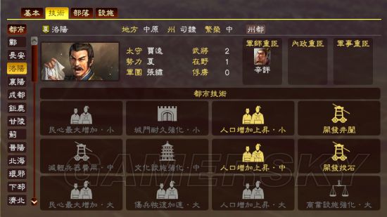 我们把视角转到都市技术,这下大家明白了吧~邺城、长安、洛阳增加兵役多,其中邺城的兵役更是增加了一倍!完全依赖这两个文化技术:人口增加上升(其实是增加兵役上升啊!!人口什么的玩蛋去吧!!),和民心最大值增加。而下邳则完全没有这两个技术,所以跟其他大众脸城市一样的增加兵役都是1134.